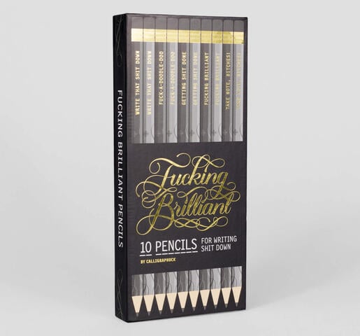 This fancy set of ten eraser toppped graphite pencils is the perfect gift for the person who has everything and does mind a few swear words . The pencils feature inspirational profanity , calligraphic flourishes , and foil stamping . A great way to add a touch of humour and irreverence to everyday writing .